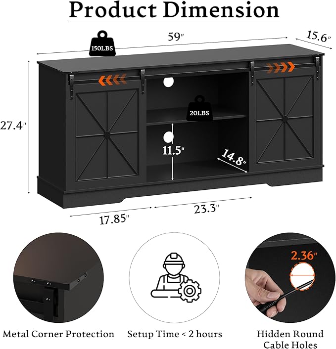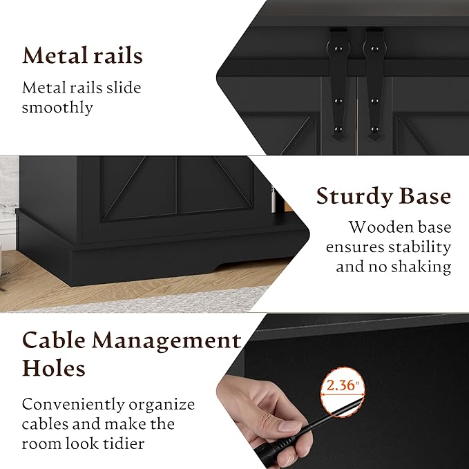 - Sliding Barn Doors &Cable Management:Durability sliding barn doors operate slide smoothly left and right on the elegant metal rails ,prevent loud slamming and pinching children hands.Hidden storage cabinets easily hide the clutter inside the TV cabinet. TV stand have built-in 2 hidden circular cable managements features to help keep wires and cables organized and out of sight, keeping your home tidy.