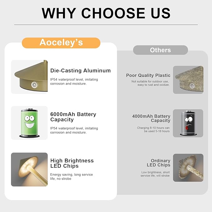 - High-Quality Materials: The lamp body of the battery table lamp is made of die-casting aluminum material, with frosted baking paint process on the surface, IP54 waterproof level, anti-corrosion and anti-rust, not easy to fade, and non-slip rubber design on the bottom. Built-in high brightness energy-saving LED lamp beads, CRI 85+,soft light is not harsh.