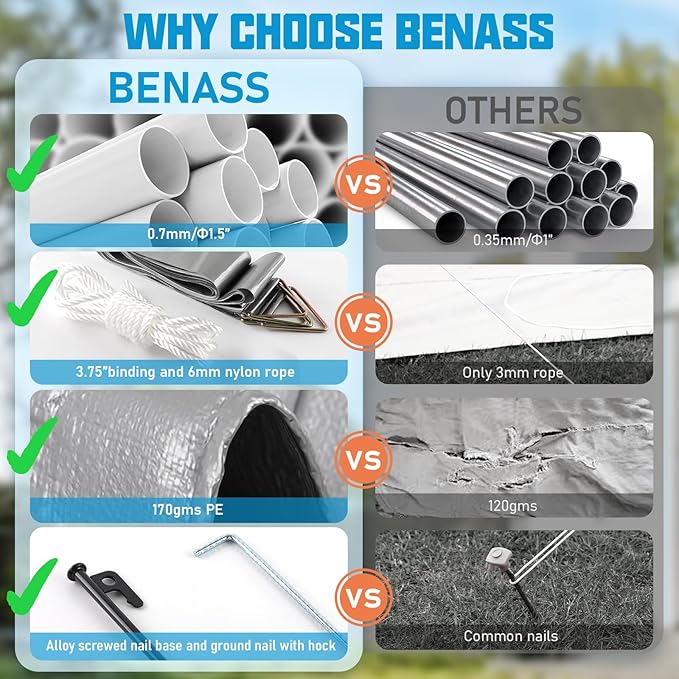 - Super Heavy Duty - Benass portable garage use 1.5" galvanized steel frame and 180gms PE canopy top, is more durable than others. Adding the accessories set, it will be firmer