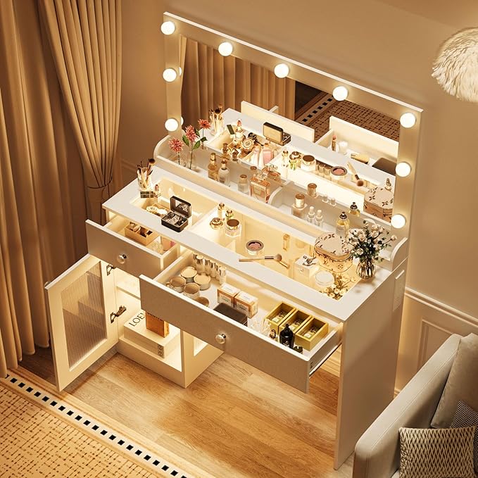 - 39.4in Vanity Desk with Mirror and Lights: Full-Size 39.4" lighted mirror for flawless application,enjoy a professional makeup experience with a large LED mirror vanity that delivers bright, even lighting — ideal for detailed beauty routines