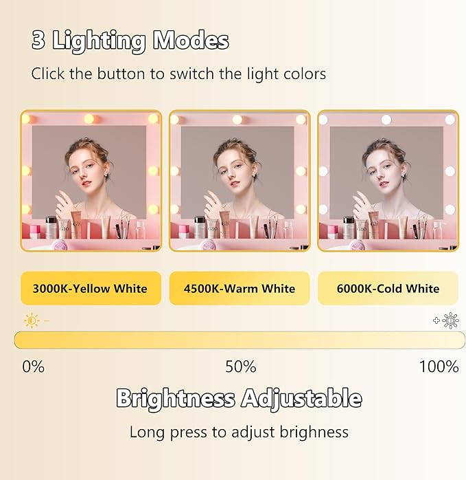 - Vanity Desk with Adjustable Lighting – BORNOON small makeup vanity desk features a large mirror surrounded by seven LED bulbs, offering three lighting modes: warm white, natural white, and cool white. With adjustable brightness, you can create the perfect lighting for makeup, live streaming, or salon use