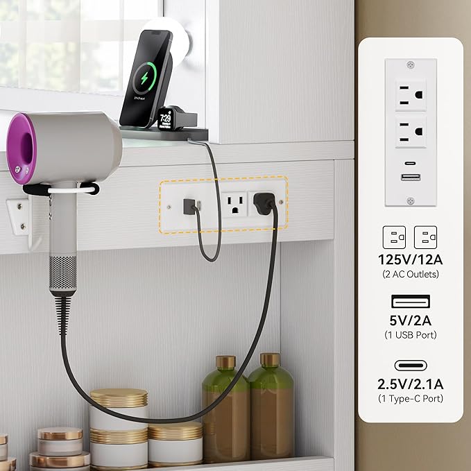 - Smart Charging Integration: Stay powered and organized with 2 AC outlets, 1 USB port, and 1 Type-C port, all conveniently placed near the hair dryer stand. Keep styling tools charged and within reach without dealing with messy cords - making your daily routine smooth and efficient