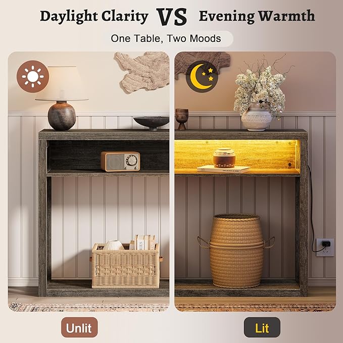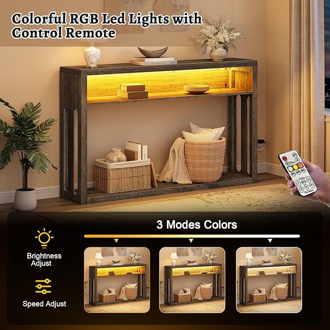 FAVOOSTY Farmhouse Console Table with Storage, 47" 2-Tier Entryway Sofa Table with Led Light Behind Couch Table Hallway Stand for Living Room, Hallway, Foyer - Gray