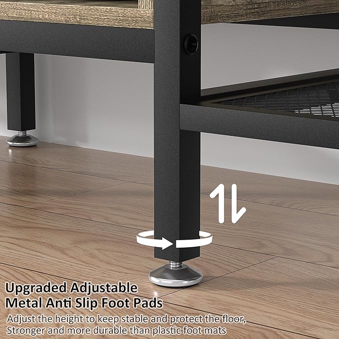 - [LARGE STORAGE CAPACITY]--Overall dimensions of the TV stand is 63” Long x 15.74” Wide x 20.47” Tall. Made of high quality MDF board, which 2 side are designed with unique metal mesh shelves, not easily deformed and good for heat dissipation. The table top can hold up to 160 lbs, each mesh shelf can hold up to 60 lbs.