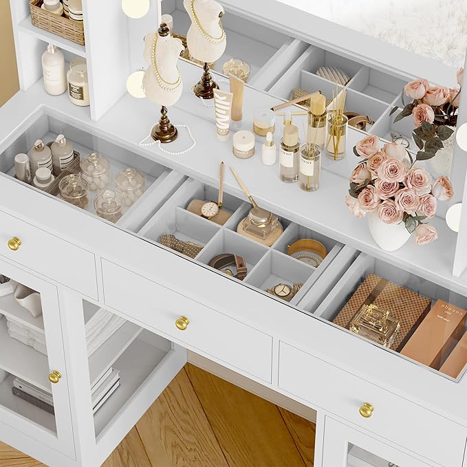 - 【Makeup Vanity with Lights and Drawers】This elegant vanity desk features a sleek tempered glass top that offers a clear view of your cosmetics and jewelry. Paired with a large mirror and 10 LED bulbs (3 lighting modes), it creates a perfect beauty station for detailed makeup application or hairstyling