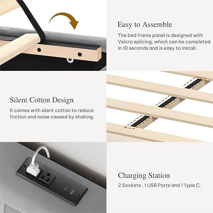 - Velvet Upholstered Platform with Charging Station - The Queen size bed frame built-in charging station, including 2 AC sockets, 1 USB port, 1 Type-c charging a variety of electronic devices at your fingertips. Exquisite button-tufted headboards per-fect for a variety of bedroom styles. The velvet fabric is breathable and gives you a skin-friendly feeling.