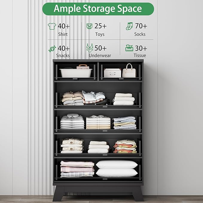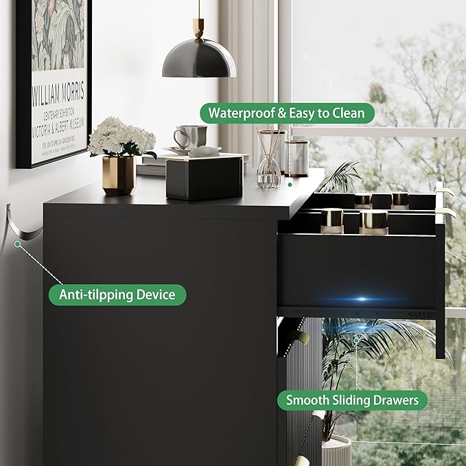- 【Stability & Safety】The white/black/natural oak/grey dresser is equipped with an anti-tipping device, which can be fixed on the wall to prevent accidents. Each drawer contains a wide metal handle and built-in slide rail, easy to push and pull. Besides, the sturdy base provides this dresser with drawers a strong support and the middle feet can be adjustable to keep balance on uneven floors