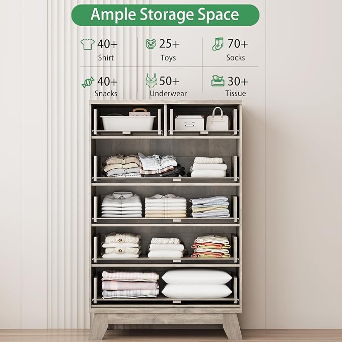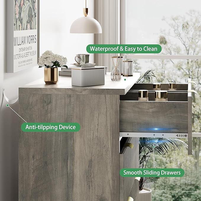 - 【Stability & Safety】The white/black/natural oak/grey dresser is equipped with an anti-tipping device, which can be fixed on the wall to prevent accidents. Each drawer contains a wide metal handle and built-in slide rail, easy to push and pull. Besides, the sturdy base provides this dresser with drawers a strong support and the middle feet can be adjustable to keep balance on uneven floors