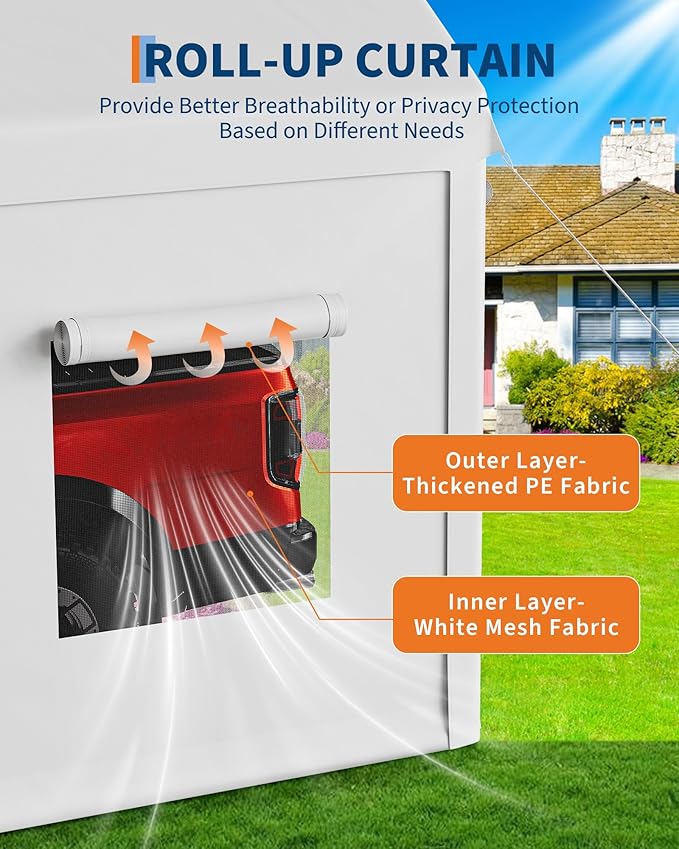 - Ventilated Design with Mesh Windows: The roll-up mesh window in the carport canopy enhances ventilation while keeping out insects, and improved tightness, it allows natural light without mosquitoes for a comfortable space