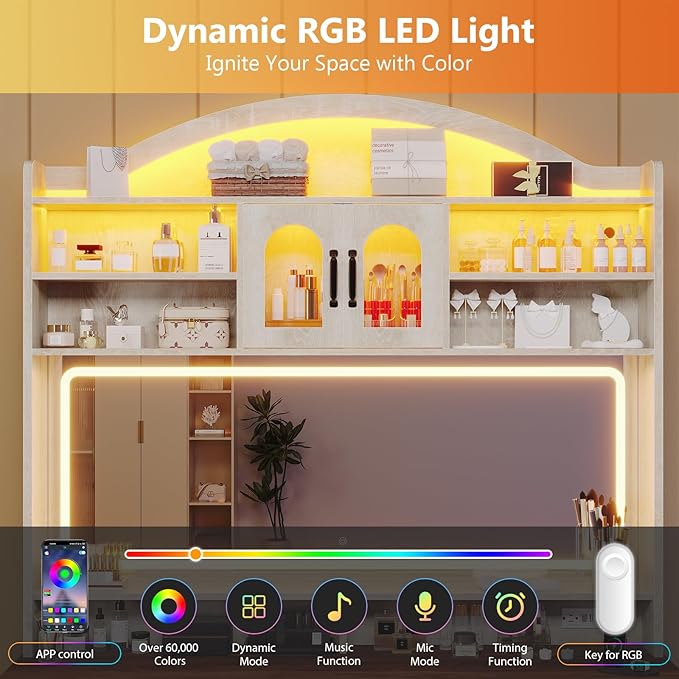 - 【Makeup Vanity with 3 Color Settings & Oversized Mirror】 Illuminate your beauty routine with our vanity mirror with lights. Featuring customizable LED brightness via touch control & dedicated app, plus an oversized mirror, it ensures flawless makeup application day or night for your makeup vanity or dressing table
