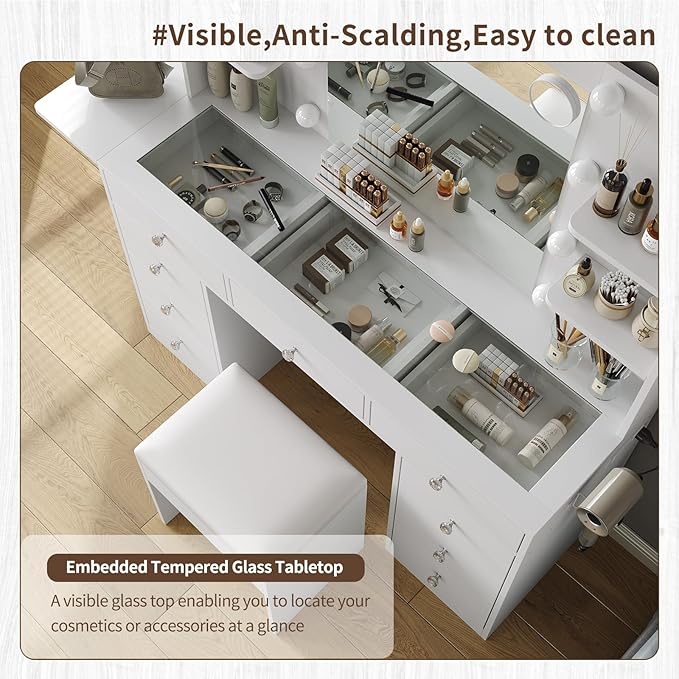 - Enough Storage Capacity: Tired of cluttered cosmetics? Our vanity desk is here to help! With 9 drawers and 4 shelves, it provides ample storage for all your beauty products, keeping your makeup area organized and tidy. Vanity is equipped with a foldable panel, you can open or fold up to get more space