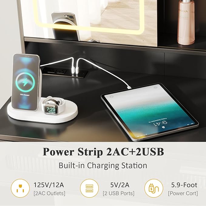 - 【Convenient Charging Station】: This girls vanity features a built-in power outlet on the left side with 2 USB ports and 2 standard sockets, allowing you to easily charge hair dryers, beauty tools, smartphones, tablets, and other devices.