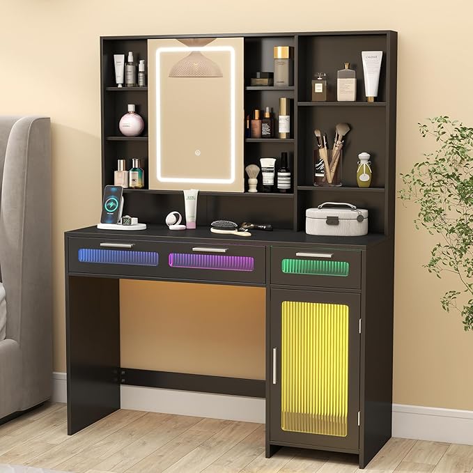 - 【LED Mirror with Touch Control & Sliding Design】:This black vanity desk features a built-in LED light bar with 3 color settings — warm, natural, and cool. Use the touch panel to switch colors or long-press to adjust brightness. Perfect for makeup, grooming, and daily use in bathrooms, bedrooms, or dressing areas.
