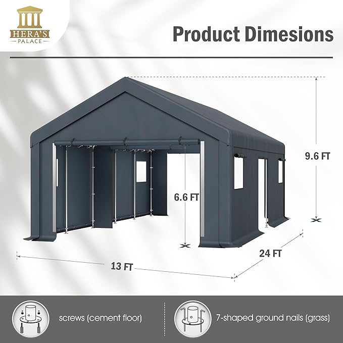 HERA'S PALACE Heavy Duty Storage Shed Outdoor Portable Car Canopy Carport Garage with 2 Rolled up Zipper Doors UV Resistant Waterproof Anti-Snow for Motorcycle Truck (Dark Gray, 13x24ft)