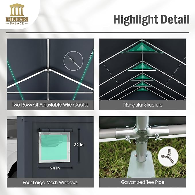 - Heavy-Duty Metal Frame: The outdoor carport is constructed with a high-quality galvanized steel frame, with 6 additional crossbars at the top forming a stable triangular structure. Iron wires are added on both sides at the top for reinforcement, significantly increasing the weight-bearing capacity. Four S-hooks (6-11 pounds limit) are included inside for hanging small items