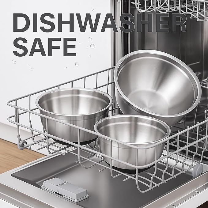 - Made from extra-thick, food-grade stainless steel, these bowls are durable, rust-resistant, and dent-proof, with a brushed matte exterior and polished interior for a stylish, modern look.