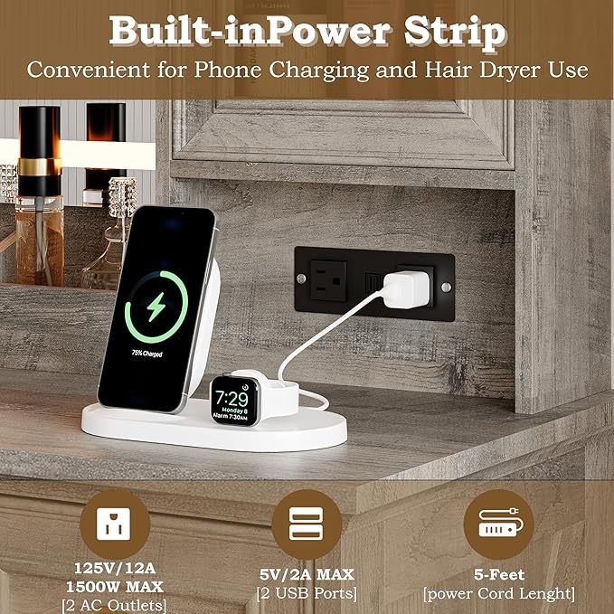 - Ample Storage & Built-in Power Outlets: BORNOON vanity offers 6 drawers, 2 RGB-lit glass cabinets, 3 makeup trays, and a spacious tabletop for easy organization. The built-in power strip with 2 AC outlets and 2 USB ports lets you conveniently charge beauty tools and devices.