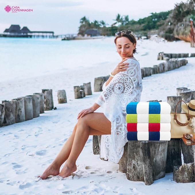 CASA COPENHAGEN Cabana Beach Towel Designed in Denmark Rough and Tough, Quick Dry, Pool, Bath & Shower 30x60 inches 4 Pieces Cotton Beach Bath Towels Set - Turquoise, Green, Pink, Royal Blue