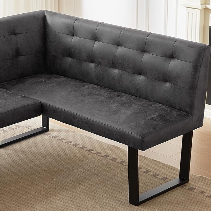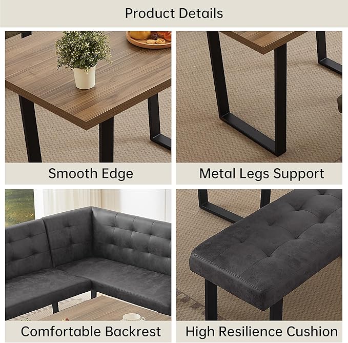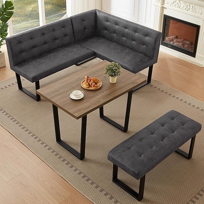 - Space-Saving Corner Design: This 3-piece breakfast nook set fits snugly in corners, saving space while comfortably seating 4-6 people. The upholstered bench can be paired with extra chairs, and the corber bench can be assembled in left or right positions to match your kitchen or dining room layout.