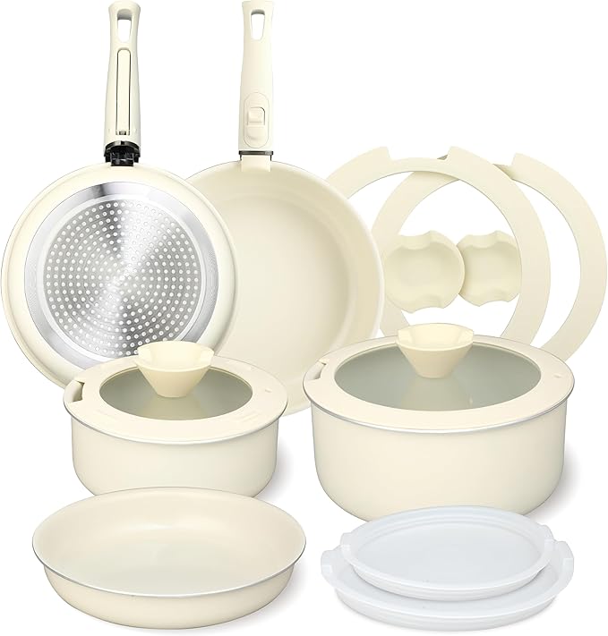 - 13-Pcs Versatile Set for All Cooking Needs: This nonstick cookware set includes 6.3"" saucepan with lid, 7.87""casserole with lid, 7.87"" fry pan, 9.45"" fry pan with lid, 11"" deep fry pan with lid, 2 detachable handles, and 2 silicone covers. Perfect for frying, simmering, steaming, or searing—ideal for home cooks, small families.