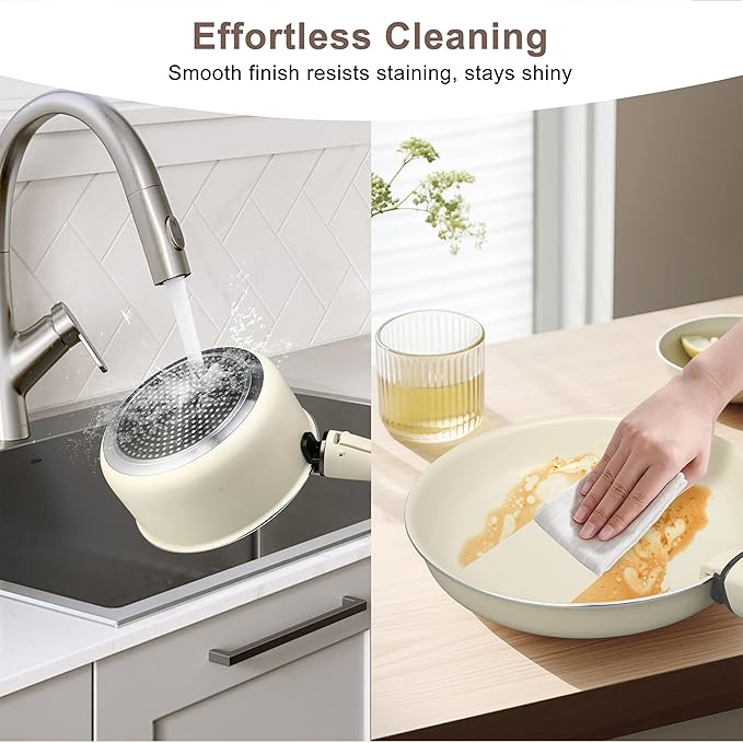 - Easy to Clean & Maintain: The nonstick surface makes cleanup a breeze. Hand wash with warm, soapy water (avoid dishwashers) to preserve the nonstick coating. Use silicone or wooden utensils to prevent scratches. Built to withstand daily use, this set combines convenience and durability, backed by a design focused on long-term reliability."