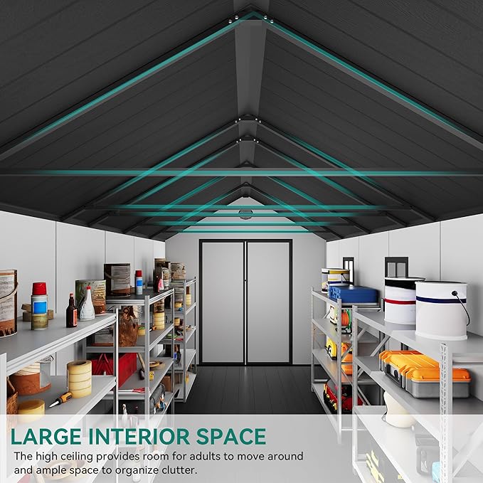- Year-Round Peace of Mind: Crafted from 16mm thick PP resin panels with a sturdy floor, this all-weather garden tool shed protects your mowers, bikes, and tools from moisture and elements, keeping everything dry, safe, and organized in every season