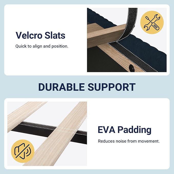 - Special Feature : Easy Assembly, No Box Spring Needed: The bed frame full includes 12 slats that support the mattress directly, and EVA foam strips help prevent creaking sounds—creating a quiet, steady base ideal for restful sleep, Sturdy Structure, Tufted, Upholstered Easy Assembly, No Box Spring Needed: The bed frame full includes 12 slats that support the mattress directly, and EVA foam strips help prevent creaking sounds—creating… See more