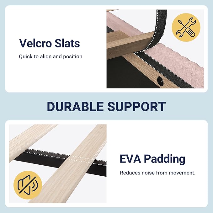 - No Box Spring Needed: The bed frame queen includes 12 slats that support the mattress directly, and EVA foam strips help prevent creaking sounds—creating a quiet, steady base ideal for restful sleep
