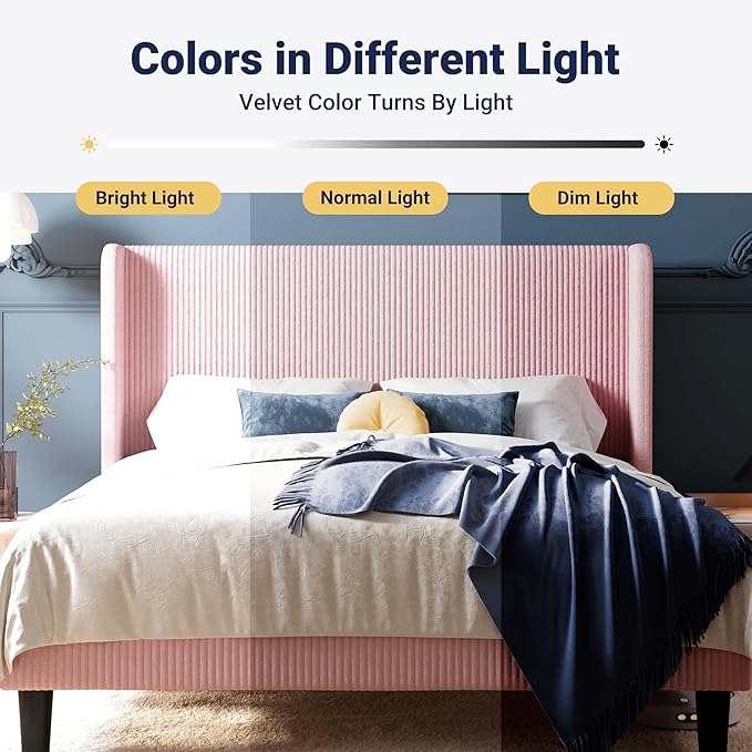 Allewie Queen Size Bed Frame with Upholstered Wingback Headboard, Vertical Channel Tufted Corduroy Velvet Platform Bed, Strong Wooden Slats Support, No Box Spring Needed, Easy Assembly, Light Pink