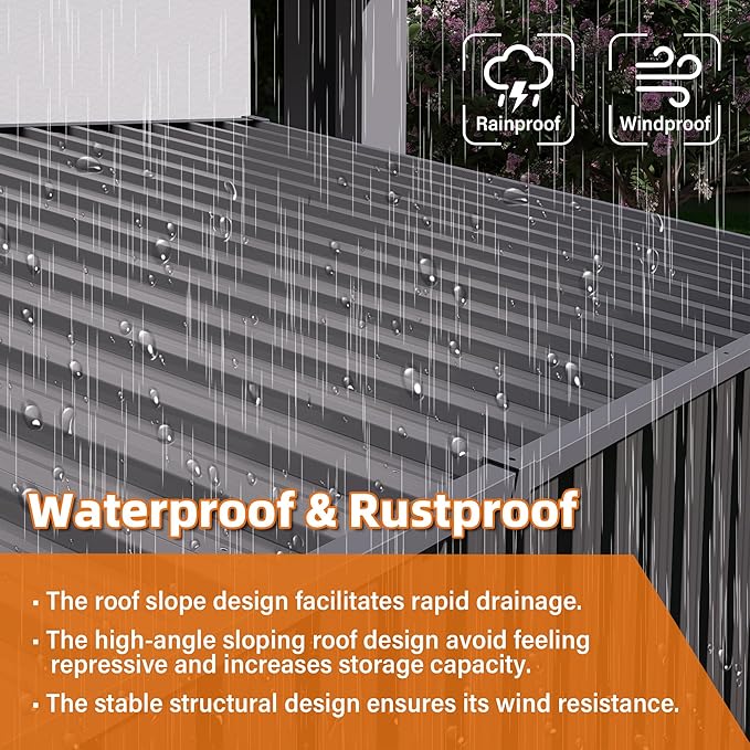 - ๐ก ๐๐ฅ๐จ๐ฉ๐๐ ๐๐จ๐จ๐ ๐ฐ๐ข๐ญ๐ก ๐๐ซ๐๐ข๐ง๐๐ ๐๏ผ The smart sloped roof design allows rainwater to drain efficiently, preventing water accumulation and protecting the metal shed from damage. The backyard storage shed ensures reliable performance through rain, snow, and sun.