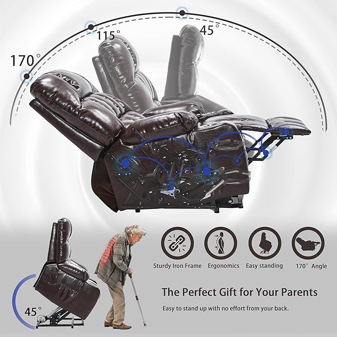 - 【Power Lift Recliner Chair for Eelderly】Integrated vibration massage and targeted lumbar heating transform this oversized recliner chair into the ultimate comfort haven for seniors. This advanced big man lift chair recliner features seamless power lift assistance, effortlessly raising you to a standing positio. Infinite electric recliner angles up to 180° and a fully reclined length of 73.22 inches, it is specially designed for big and tall individuals seeking extra space and comfort. The generous 25.59 inches wide seat provides ample room to unwind and enjoy luxurious comfort.