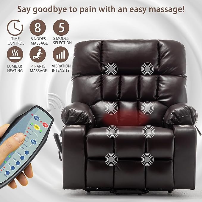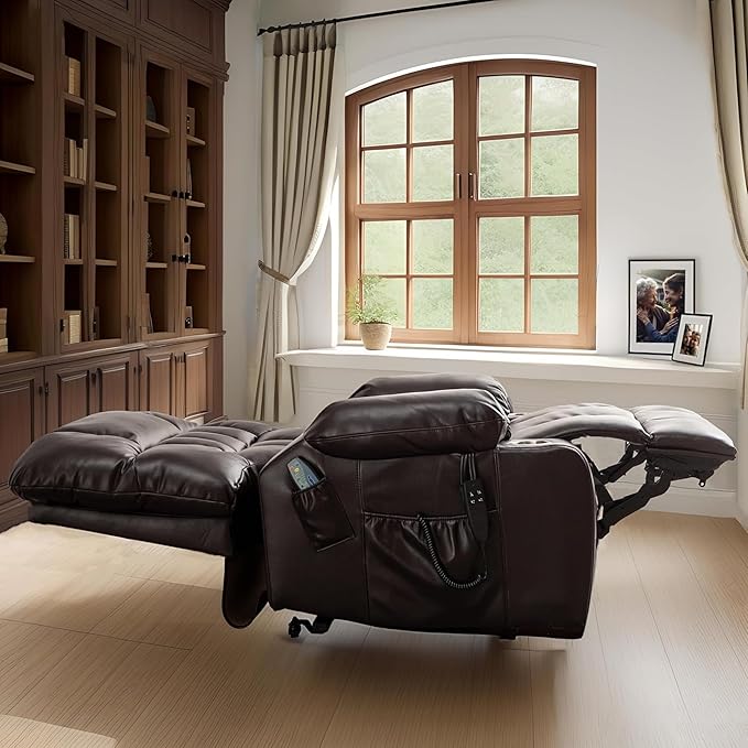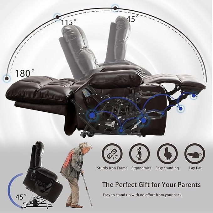 - 【Power Lift Recliner Chair for Eelderly】Integrated vibration massage and targeted lumbar heating transform this oversized recliner chair into the ultimate comfort haven for seniors. This advanced big man lift chair recliner features seamless power lift assistance, effortlessly raising you to a standing positio. Infinite electric recliner angles up to 180° and a fully reclined length of 73.22 inches, it is specially designed for big and tall individuals seeking extra space and comfort. The generous 25.59 inches wide seat provides ample room to unwind and enjoy luxurious comfort.