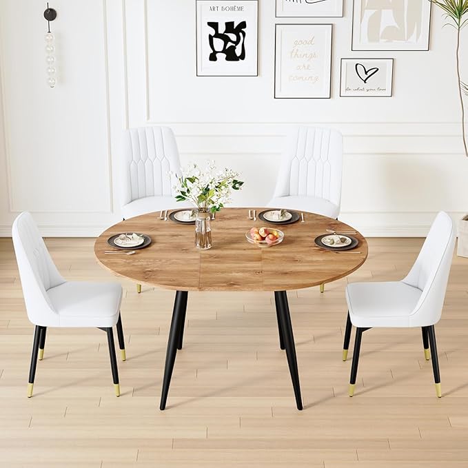 - [Extendable Dining Table Set for 4] This mid century modern dining table set is perfect for small space. The extendable and wood finish design can fit in most home decor. Whether it's a family dinner, a friendly gathering, or a casual meal with loved ones, this round dining table set is the perfect choice, comfortably seating 4–6 guests