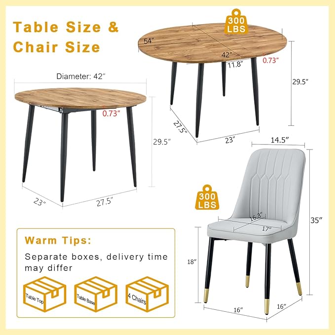 - [Round Dining Table Set for 4] The tabletop for this kitchen table set is made of 0.73" thick wood, and it can transform from 42" round to 54" oval. You will find a perfect balance with the adjustable footmat under each tableleg. In order to protect children from injured, the table edge is designed smooth