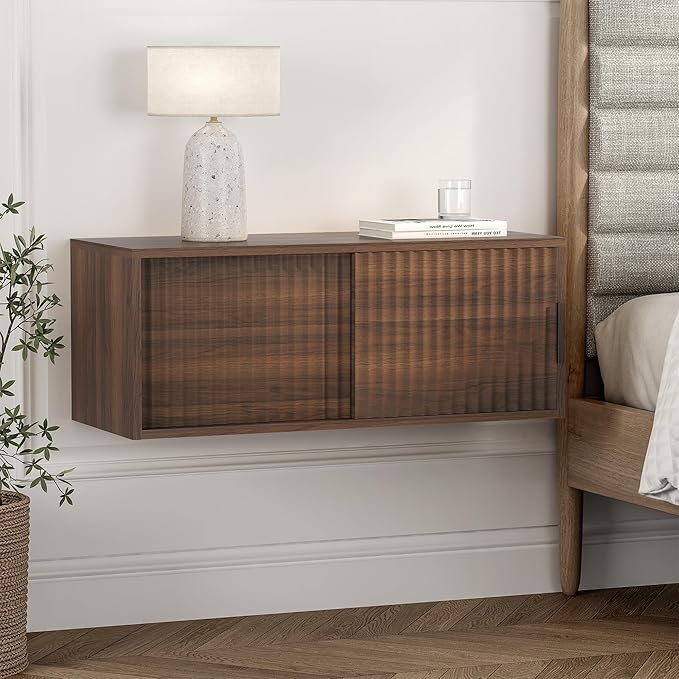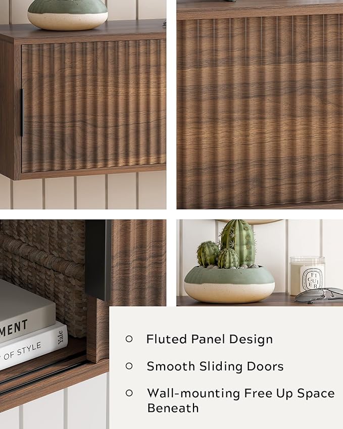Fluted Floating TV Stand Set of 2, 30" Multi-Purpose Modern TV Display Shelf Console Entertainment Center Cabinet with Sliding Doors for Bedroom Living Room Entryway, Brown