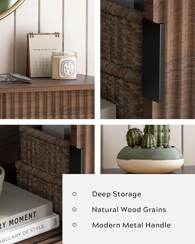 - 【Timeless design】 Boasting a smooth sliding modern panelled frame design and classy black handles, it is meticulously crafted with particle board and enveloped in a high-quality laminate. This not only ensures durability but also showcases an enchanting wood grain design pattern. A fluted door design and breathable storage with sliding doors, imparting a soft and inviting look to your space