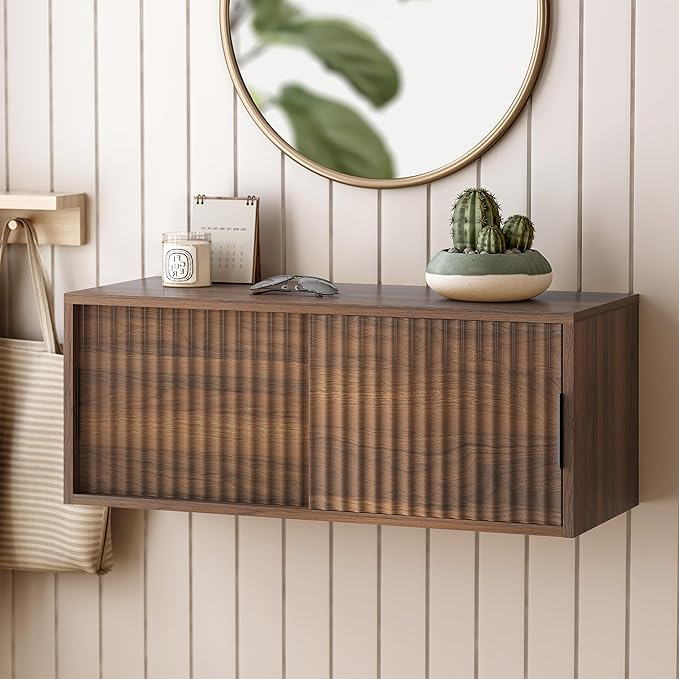 Fluted Floating TV Stand, 30" Multi-Purpose Modern TV Display Shelf Console Entertainment Center Cabinet with Sliding Doors for Bedroom Living Room Entryway, Brown