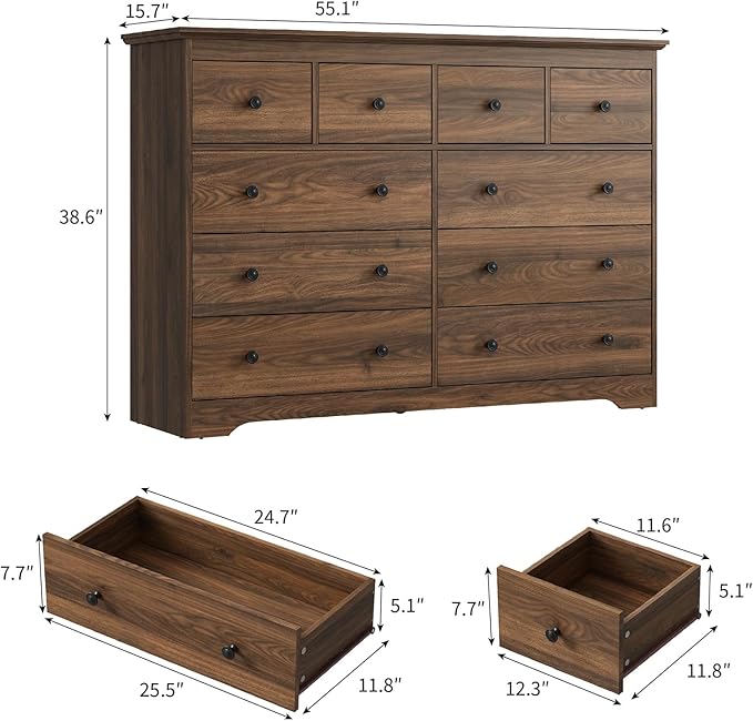 - 【10 Drawers Dresser for Bedroom】This classic brown dresser features 6 large drawers (11.8"D x 24.7"W x 7.7"H) and 4 small drawer(11.8"D x 12.3"W x 7.7"H), designed to help you effortlessly organize and store clothes, toys, blankets, and other personal belongings, providing a clutter-free and tidy home
