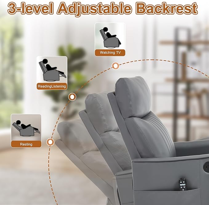 Manual Swivel Rocker Recliner Chair for Adults, Overstuffed Recliner Glider with Massage and Heat, Living Room Reclining Chair, PU Leather Gray
