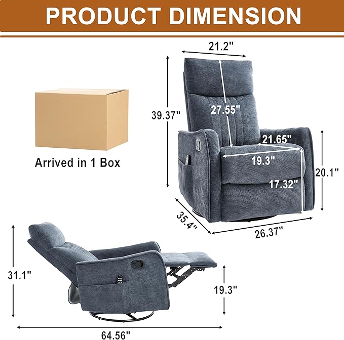 - PREMIUM QUALITY: The swivel glider recliner is overstuffed with high-density sponge to provide you with great softness. The manual swivel rocking chair is upholstered with high-quality chenille fabric, which is durable and breathable, with a good touching. The metal frame base can hold up to 350lb, durable and secure enough to support a adult man.