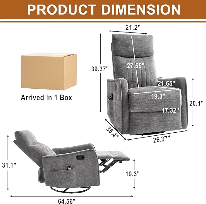 - ATTENTIONS: 1. The swivel rocking chair doesn't fit for the elderly, the pregnant women, the disabled, and the legged inconvenient people, because it needs heel force to put the footrest down. 2. The manual swivel rocker recliner is packed in one box. 3. Without lifting function.