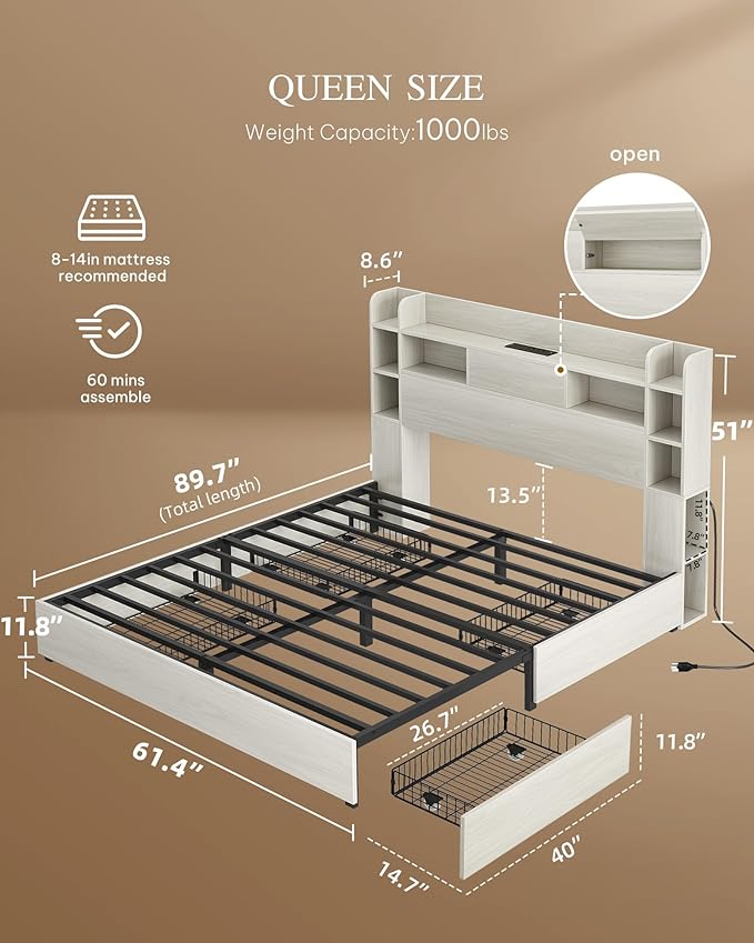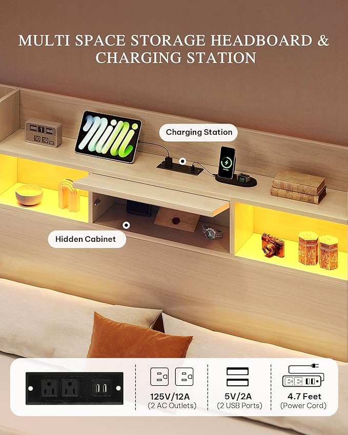 - BUILT-IN CHARGING STATION - The queen size storage headboard bed frame built-in charging station, including 2 AC Outlets, a USB port and a type-C port, allowing you to charge various electronic devices within easy reach.