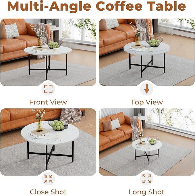 Coffee Table, 23.6" Coffee Tables for Living Room, Round Coffee Table with Metal Frame, Floor Table for Sitting on The Floor, Home, Office, White