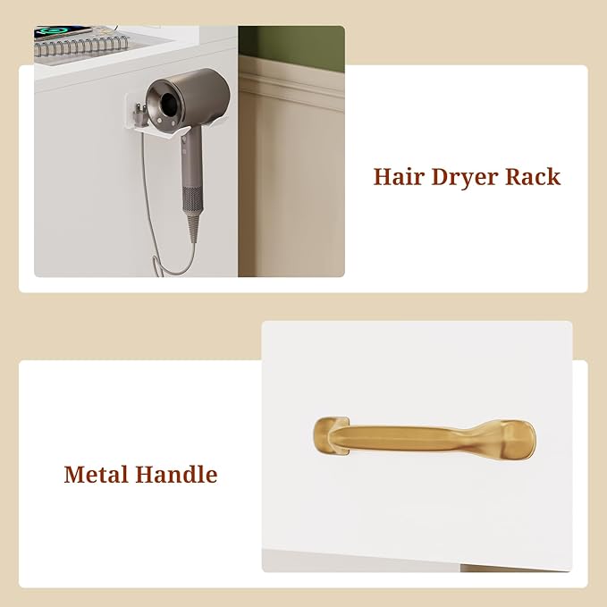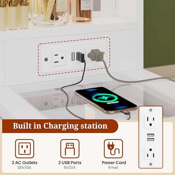 - BUILT-IN CHARGING STATION:The modern vanity is equipped with a power strip, including 2 standard sockets and 2 USB ports, which is convenient for using a hair dryer or curling iron in front of the dressing table, as well as charging mobile phones, tablets or other electronic devices.