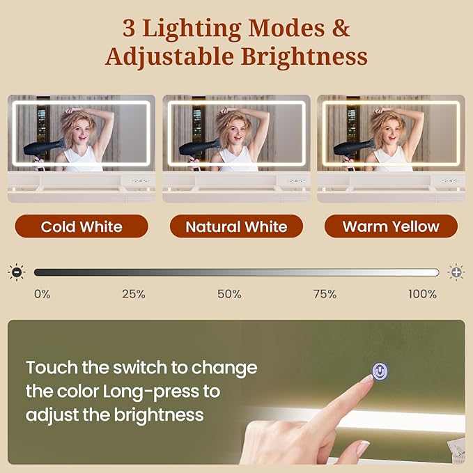 - 3 LIGHTING MODES & BRIGHTNESS ADJUSTABLE:The large mirror is equipped with LED lights with adjustable colors and brightness, which can perfectly adapt to various ambient lights. Cool white is used for formal makeup, warm white is used for skin care or daily makeup, and warm yellow is used for dinner or party makeup. The vanity mirror creates the most comfortable makeup environment for you, and you can easily put on beautiful makeup.