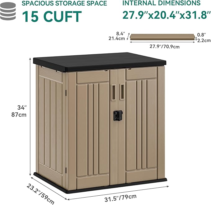 - Aesthetic Storage Shed for Any Space: Designed to blend seamlessly into your outdoor decor, this compact 31.1"H x 23.23"W x 34.2"D plastic storage shed combines functionality with beauty, enhancing your patio or yard with its elegant wood-like finish