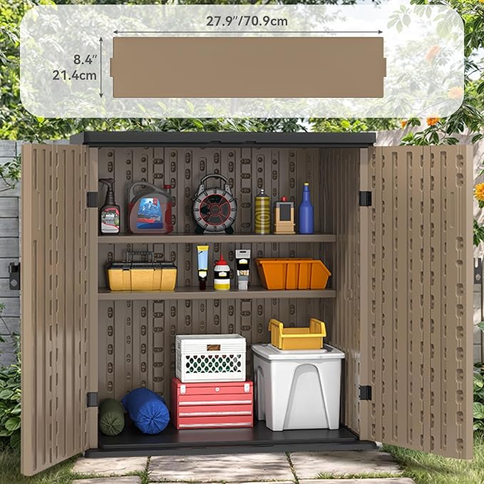 - Built-In Shelves for Tidy Storage: This small outdoor storage shed provides 110 gallons of space; Inside its 27.95"H × 20.47"W × 31.89"D interior, two included shelves offer flexible storage for gardening tools, pool supplies, and accessories
