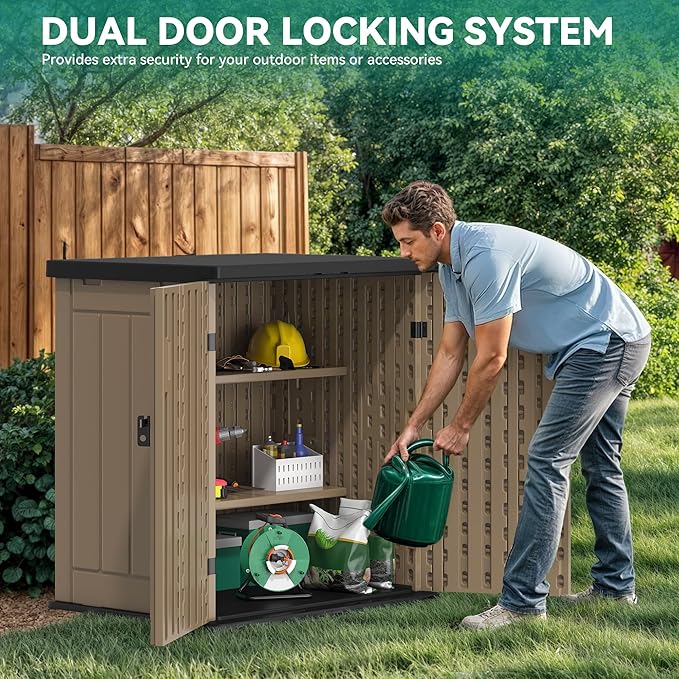 - Easy-Setup Outside Storage Sheds: Delivered in one box with 2 sturdy partitions, this weather-resistant outside storage cabinet assembles effortlessly, providing a reliable, low-maintenance solution for organizing your outdoor essentials with style and ease