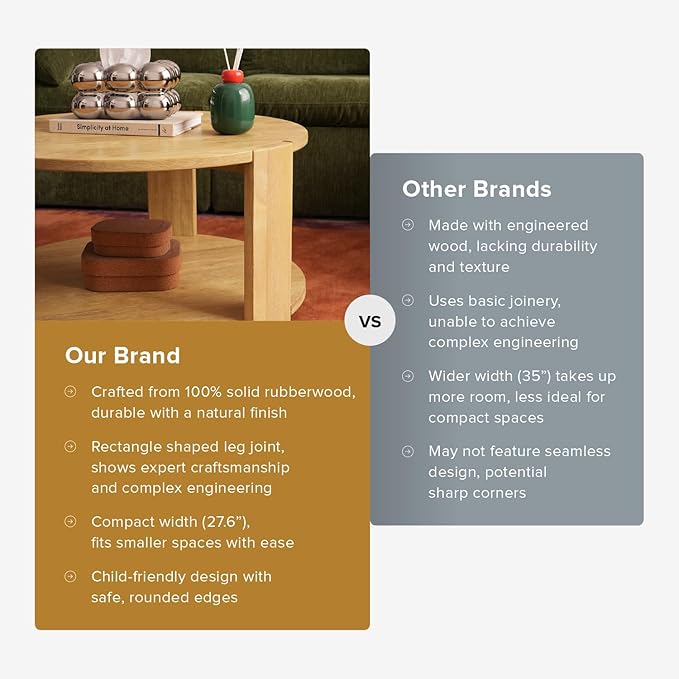- 100% Solid Rubberwood with Finger Joint Joinery: Round wood coffee table with a sturdy build and wire brush finish, durable and hides life’s little scratches