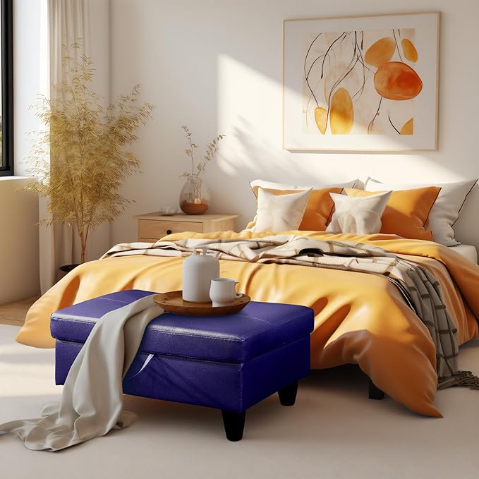 - PREMIUM MATERIALS: This storage ottoman features a thick foam cushion for added comfort. Built with a sturdy solid wood frame and durable plastic feet, it offers long-lasting quality while protecting your floors from scratches. The easy-to-clean faux leather surface gives it a sleek, modern look, and the smooth faux leather lid adds an extra layer of comfort for sitting. Perfect for any room, this ottoman combines style, durability, and functionality.